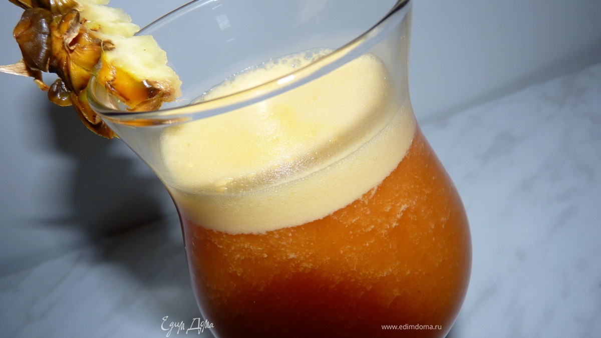 Выжать сок из апельсинов и ананаса. Манго и клубнику выложить в блендер, добавить сок апельсина и ананаса, взбить. Сахар по желанию. - Шаг 2