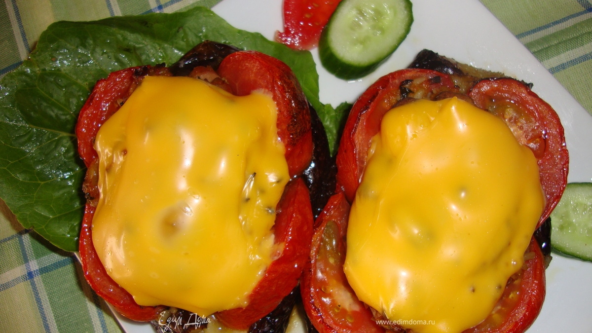 жареные баклажаны ставим на жароне и осторожно открываем.режим одну помидор и ставим во круг баклажана (как на фото) и наполняем баклажаны .ставим в духовке на 200гр.с на 20 минут,потом баклажаны закривайте с сыром и продолжайте в духовке опять 5-10 минут пока сир ни будит таят - Шаг 3