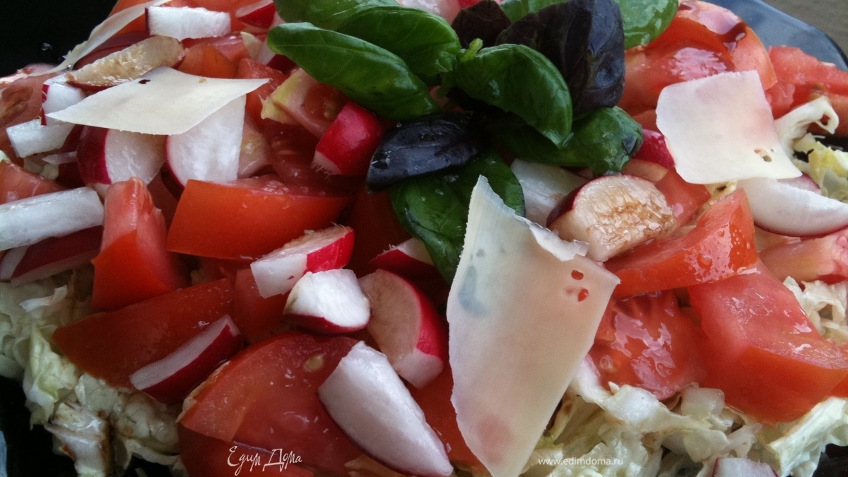Свежие овощи промыть,просушить с любовью измельчить, уложить в тарелку. Посолить, полить бальзамиком и оливковым маслом. Украсить Пармезаном и наслаждаться. Такого салата можно съесть сколько угодно и даже на ночь :))))) У меня он был на завтрак!!!