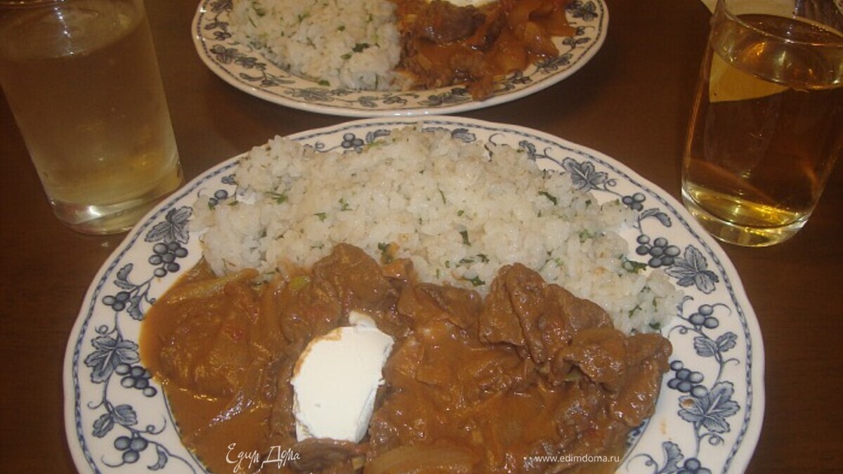 - Шаг 4Подаем с зеленым рисом ( рис+немного сливочного масла + петрушка ) На бефстроганов сверху выкладываем сметану по вкусу. Приятного аппетита!