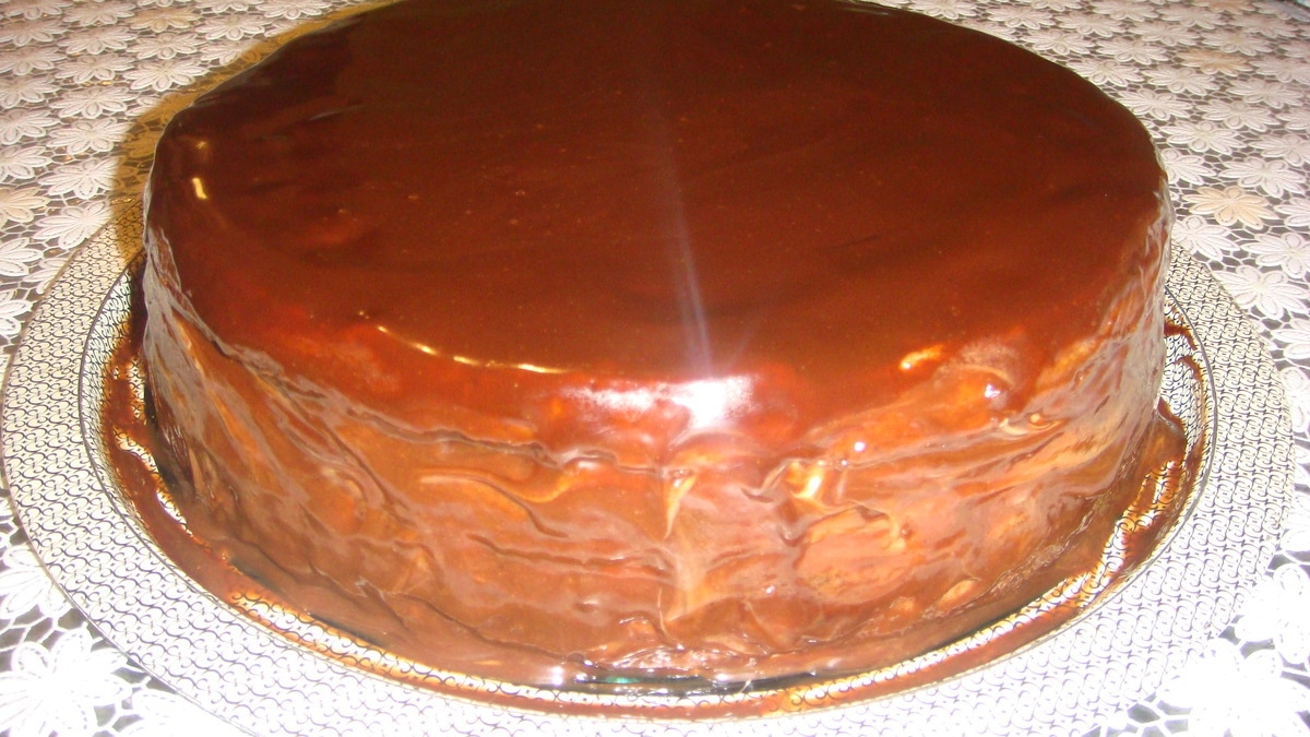 - Шаг 5Пропитываем коржи приготовленной пропиткой для торта. Смазываем коржи кремом. Верхний корж кремом не смазывам, а выливаем на него глазурь и равномерно распределяем по всей поверхности.