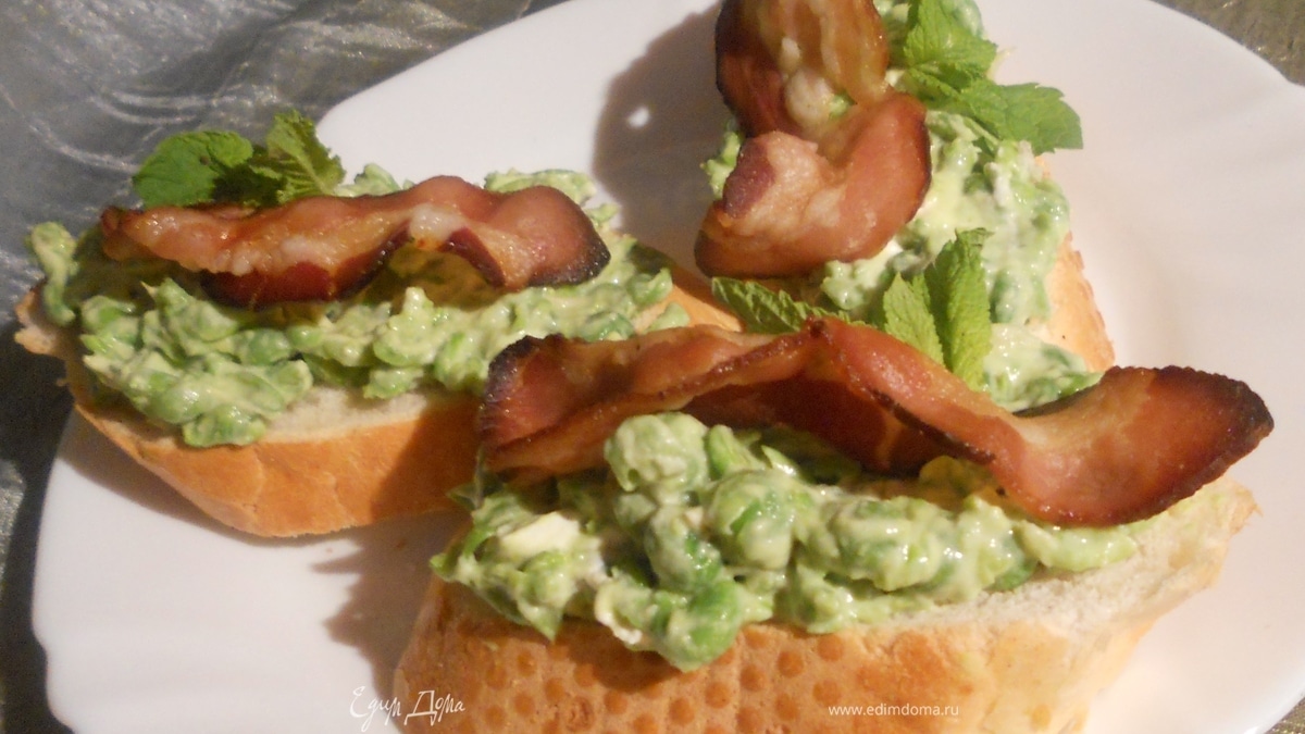 Очень мне нравится дуэт горошка с мятой, вот и в брускетту он хорошо вписался, а бекон замечательно подчеркивает его свежесть. В общем, я доволен!