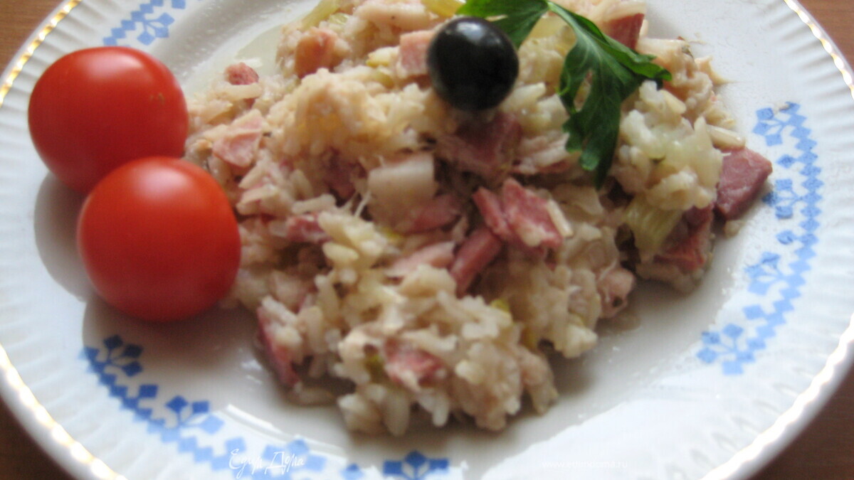 - Шаг 2Всыпать рис. Перемешайте и посмотрите - рис должен стать немного влажным и блестящим. Если рис пытается остаться сухим (возможно мясные деликатесы попались не жирные или их просто не так много) - ничего страшного, мы ему этого не позволим :) В этом случае добавьте еще немного оливкового, а еще лучше сливочного масла.