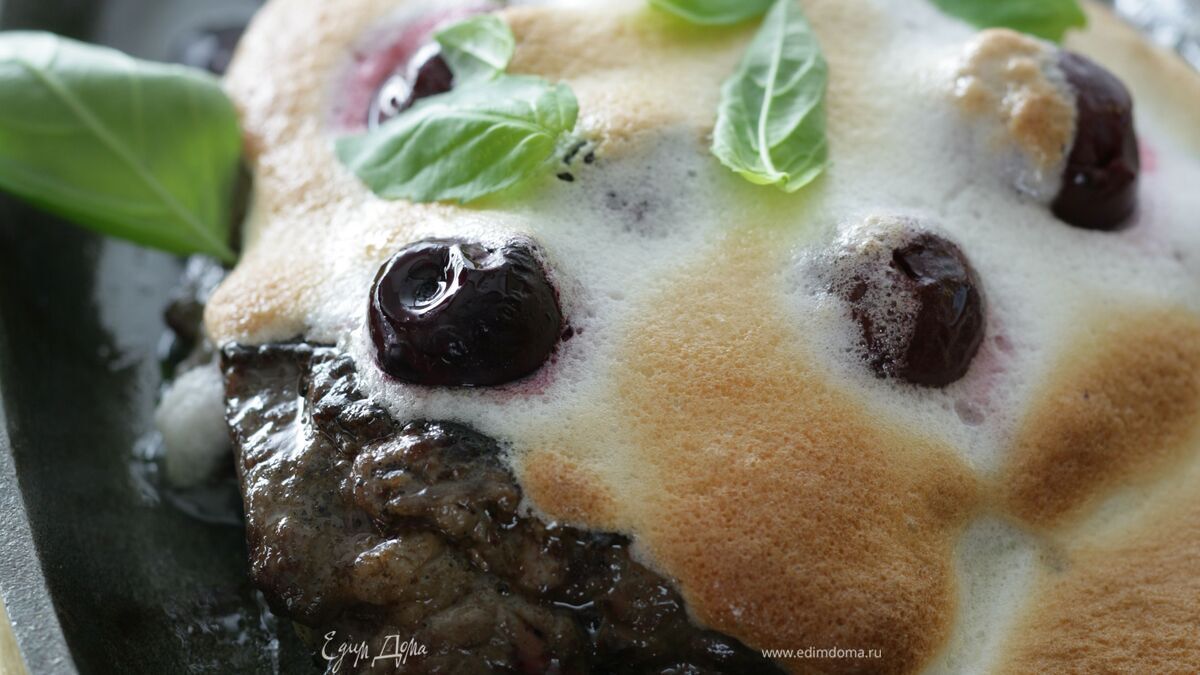 1. Кусок говядины отбить целиком (толщина отбитого должна быть с палец), сделать глубокие надрезы по всей поверхности, посолить, поперчить и обжарить на сковороде по 4-5 минут с каждой стороны. 2. Белок посолить и взбить до увеличения его в объеме в 2-3 раза, затем, не прекращая взбивать, добавить пудру и уксус. 3. Мясо уложить в жароупорную форму, сверху выложить белковую смесь, затем вишню и поставить запекать в разогретую до 200˚С духовку на 10 минут. Если мясо «кровит», время запекания можно увеличить до 20 минут, но следить, чтобы белок сверху не подгорел. 4. Все ингредиенты для соуса поместить в блендер и измельчить до однородной консистенции. Готовое мясо подавать с соусом.