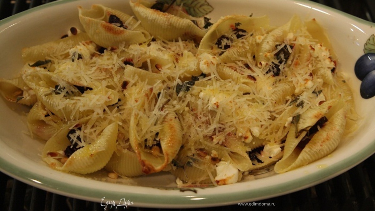 Сверху выложить еще один слой ракушек, начинить их свеклой, присыпать козьим сыром, сбрызнуть оливковым маслом, посыпать кедровыми орехами и шалфеем, порванным руками. Отправить форму под гриль на 5 минут.