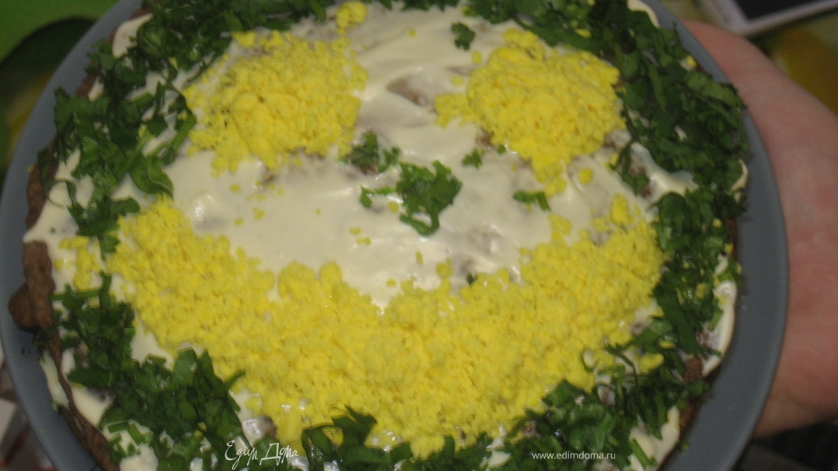 Шаг последний-заключительный :) промазываем наши коржики - блинчики соусом. Немного придавливаем каждый слой сверху,чтобы тортик не разваливался и был плотным. Верхний коржик я слегка помазала майонезом, и украсила зеленью и желтком. Тортик должен постоять в холодильнике часа 2, чтобы успеть пропитаться! Ну, а ваша задача не подпустить за это время мужа к холодильнику :) Приятного аппетита!