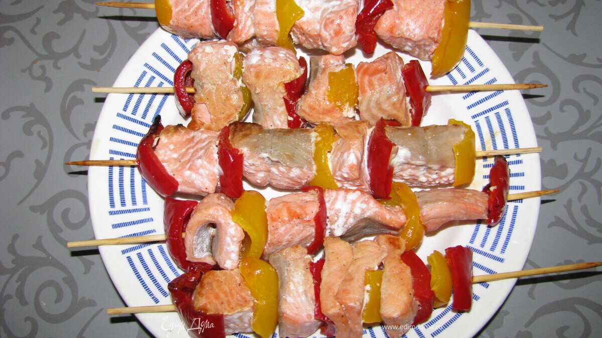 - Шаг 2Насаживать на шпажки по очередности перец и рыбу .