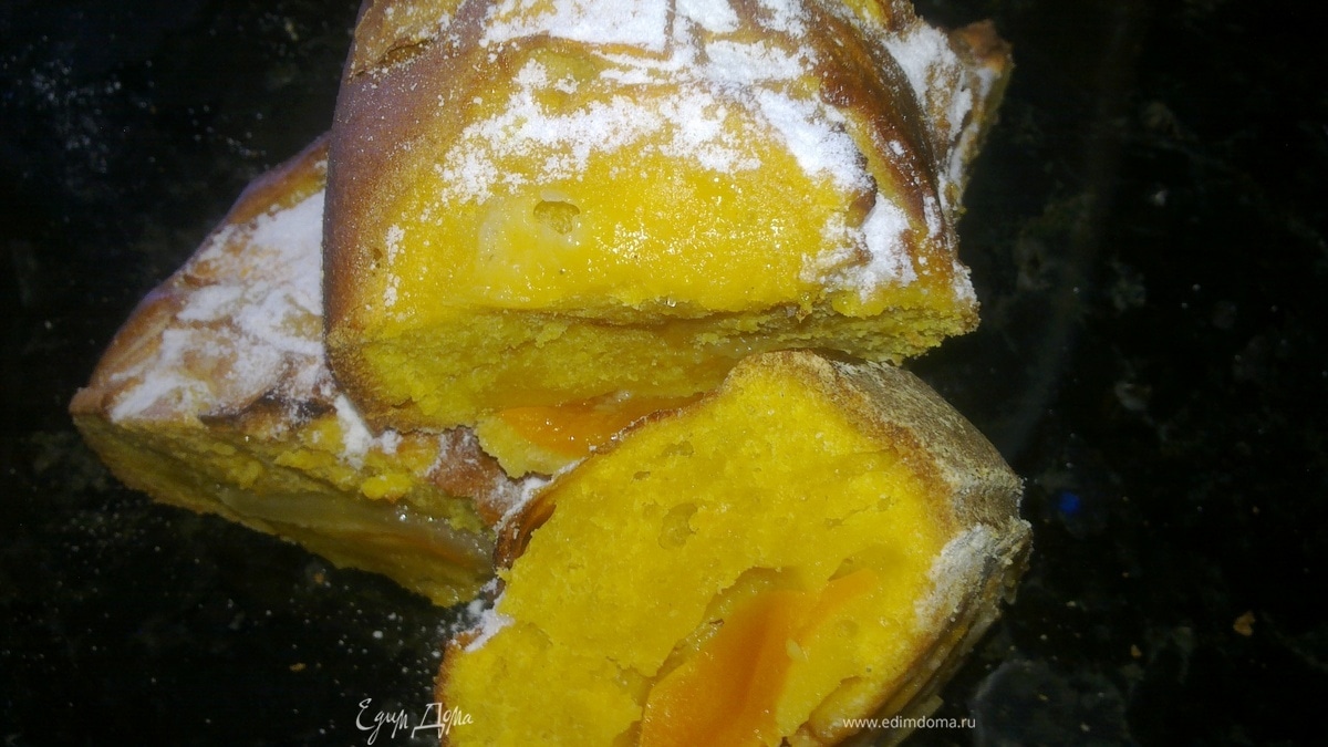 После этого готовое тесто заливаем в нашу форму ,распределив равномерно.Сверху выкладываем тоже попеременно пластинки яблока и тыквы. - Шаг 10