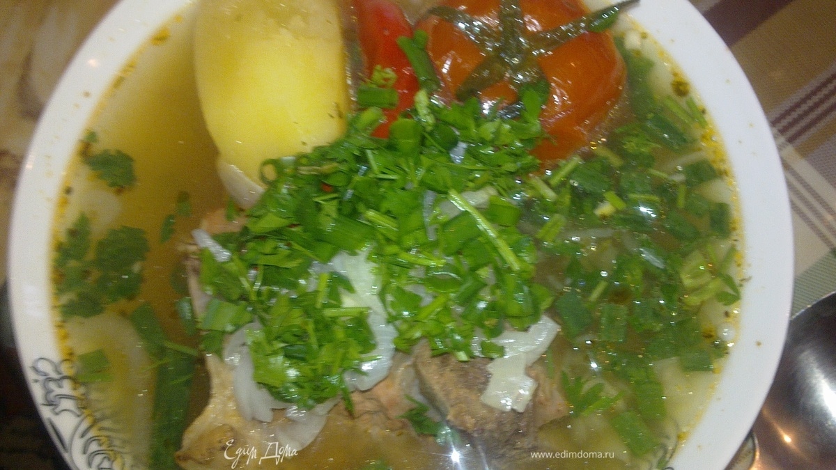 Нарезаем зелень,достаем шумовкой прокипевший чеснок и разливаем по тарелкам,выкладывая в каждую по 2 куска мяса,2 картошки 1 перец,1 помидор.Сверху кладем наш промаринованый лук хорошую полную ст.ложку и нарезаную зелень.Какая вкуснятина!