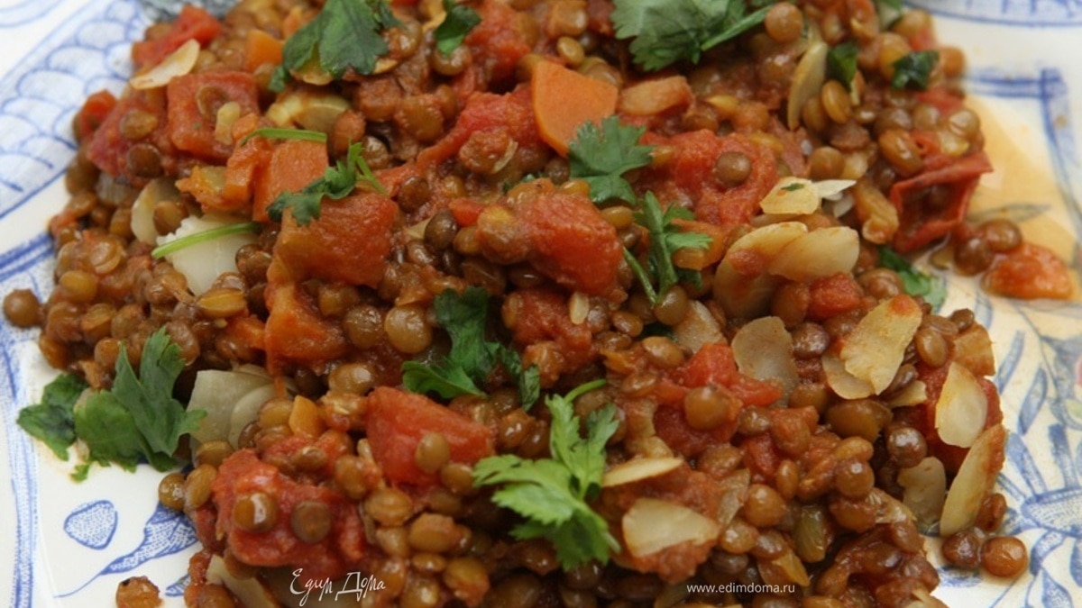 Готовую чечевицу прямо в сковороде присыпать миндальными хлопьями, выключить огонь, закрыть крышкой. При подаче посыпать измельченной кинзой.