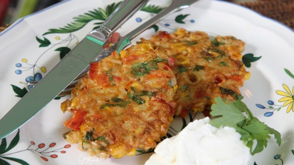 Соединить сладкий перец, кукурузу, зеленый лук и кинзу, добавить яйца, молотую паприку, посолить, поперчить. - Шаг 4