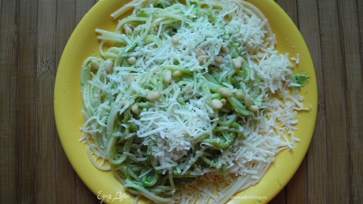 Измельчить чеснок с солью, добавлять по одному листику редиски и растирать, пока не закончатся все. Затем добавляя понемногу орешки, продолжать растирать. В конце добавить оливковое масло. Песто готово. - Шаг 2Сварить спагетти «аль-денте». Оставить немного отвара. Смешать с песто. Если необходимо, добавить отвар. Посыпать сверху пармезаном. Очень вкусно.