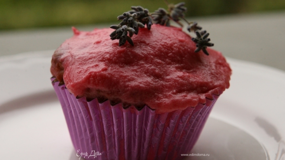 Остывшие кексы покрыть сверху кремом и украсить оставшимися веточками лаванды.