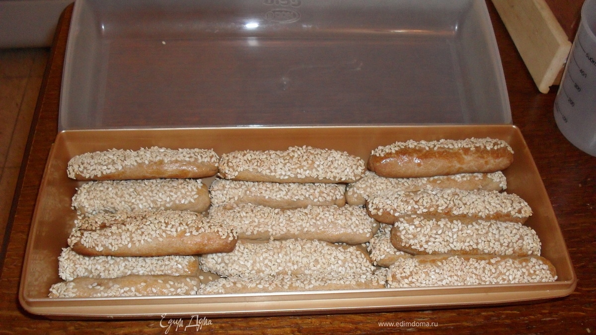 Смешать сухие продукты,добавить размягчёный маргарин или натёртый на тёрке,лучше сливочное масло.Влить растительное масло и воду(чай-стевия).Вымесить мягкое тесто,муку естественно просеять.Разделить тесто на кусочки и потом на маленькие кусочки в 3 см.Слепить,раскатать между ладонями или на столе палочки-сосиски.Взбить яйцо и кисточкой смазать только с верхней стороны.Обмакнуть в кунжуте или в маке.Выложить на протвинь с бумагой.Выпекать 20 минут при температуре 200 градусов(в моей духовке 170 градусов)