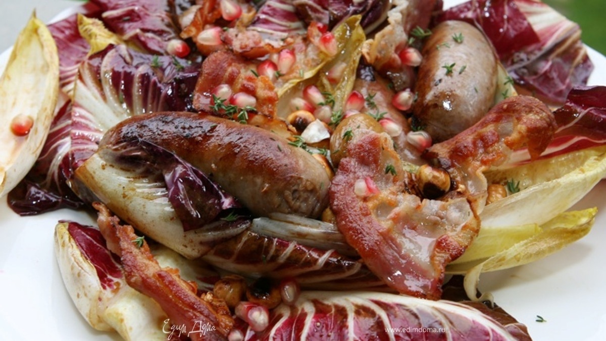 Сверху разложить бекон, присыпать горстью зерен граната и листьями тимьяна.