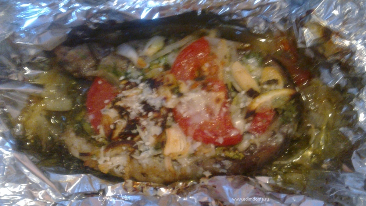 Делаем карман из фольги,сверху выкладываем пару кусочков помидора,нарезаный пластинами чеснок.