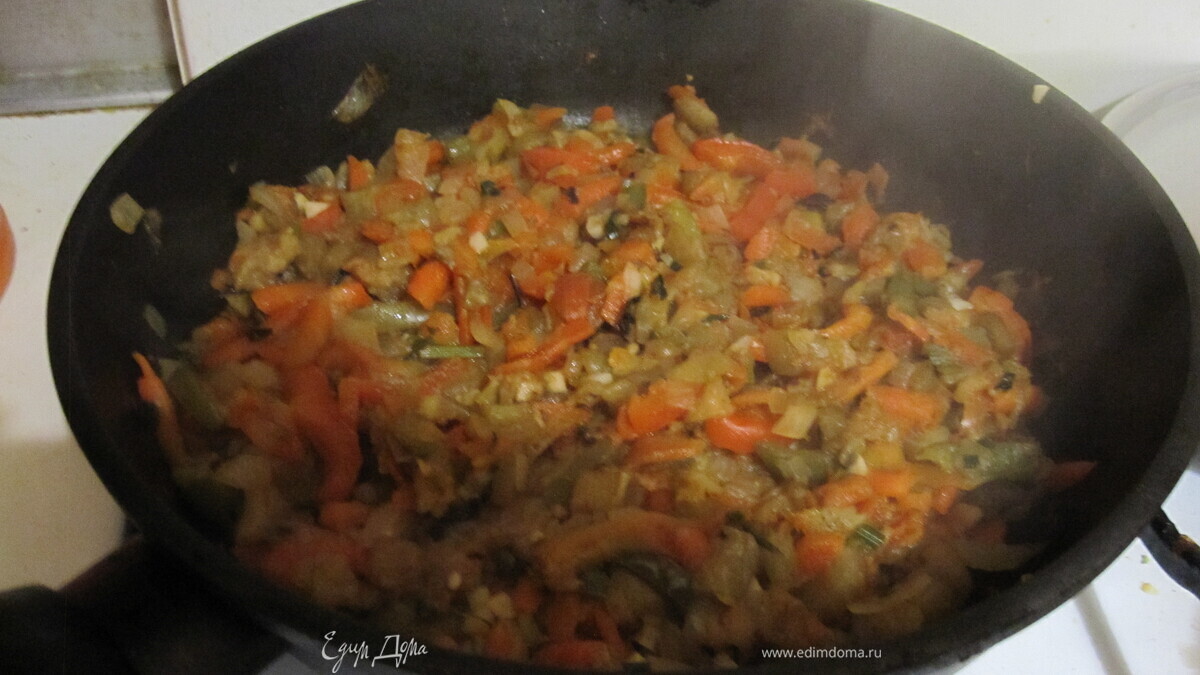 - Шаг 1Сотейник (глубокую сковороду) поставить на среднесильный огонь (должно жариться, а не томиться), налить постного масла (например подсолнечное раф.). Положить туда сначала перец и морковь потом баклажаны и лук, минут через 3-5 посолить и перемешать, жарить дальше периодически помешивая, чтобы не подгорало, но и не слишком часто.Можно накрыть крышкой легкой и плоской от алюминиевой кастрюльки меньшего диаметра, чтобы убыстрить процесс, но чтобы воздух туда попадал.