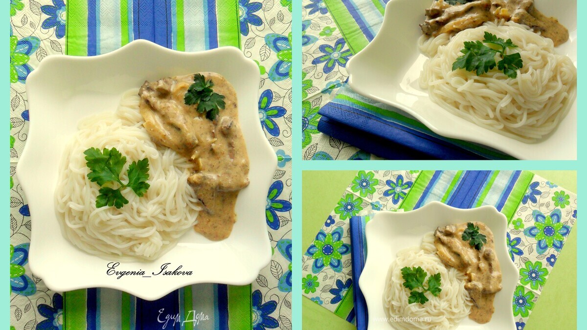 Печень по-строгановски с рисовой лапшой