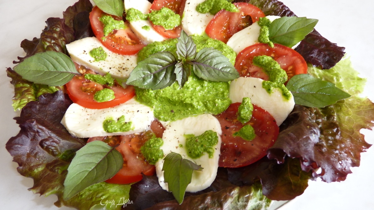 Моцарелла с помидорами под соусом песто