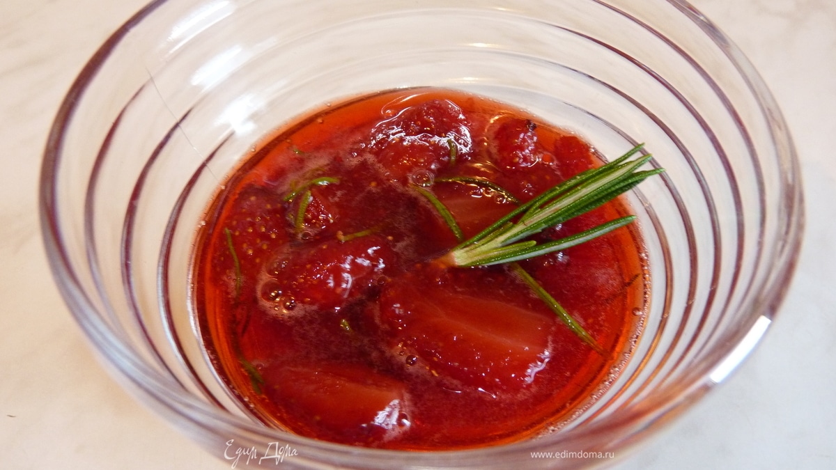 Очищенную клубнику уложить в кастрюлю, пересыпая сахаром. Подождать пока выпустит сок. Поставить на огонь, добавить розмарин, довести до кипения и варить 2 минуты. Охладить. Затем опять довести до кипения, снять с огня (зависит от сорта клубники, чем больше сока образовалось, тем больше варить).