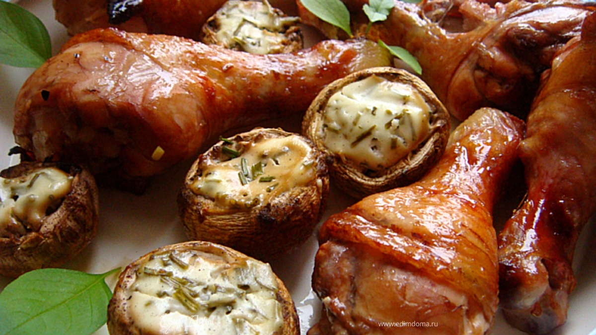 Голени достать из маринада, убрать лишний лук, присолить и немного смазать раст.маслом (чтоб не прилипли к решетке- выложить на решетку, выложить рядом шампиньоны. Готовить в хорошо прогретой и горячей духовке порядка 40 минут, периодически переворачивая голяшки - Шаг 4