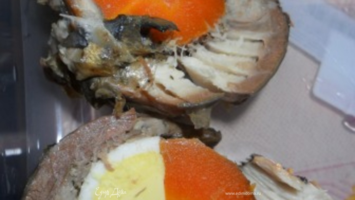 - Шаг 1рыбу зазморозить.отделить кости.разделить на 4 филе.каждое осолить и поперчить.морковь и яйца разрезать по полам.посыпать желатином и свернуть рулетики .завернуть в фольгу и в духовку на 30 мин.затем не вынимая из фольги охладить.порезать на кусочки.