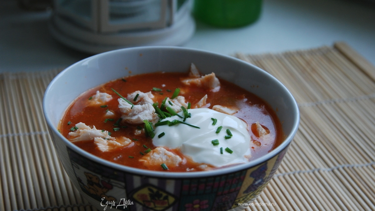 - Шаг 4Разлить по тарелкам и добавить мелко нарубленную курицу и ложку сметаны. Украсить можно зеленным луком.