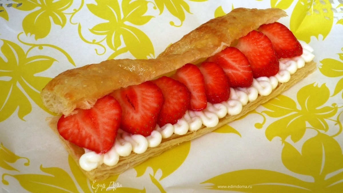 Тем временем клубнику чистим, моем и нарезаем тонкими пластинками. Просеиваем сахарную пудру, добавляем мякоть ванили (или ванильный сахар), маскарпоне. Все хорошо перемешиваем. С помощью кондитерского мешка выкладываем крем на основу слоеного теста, сверху распределяем клубнику, накрываем второй половинкой теста. Приятного аппетита!