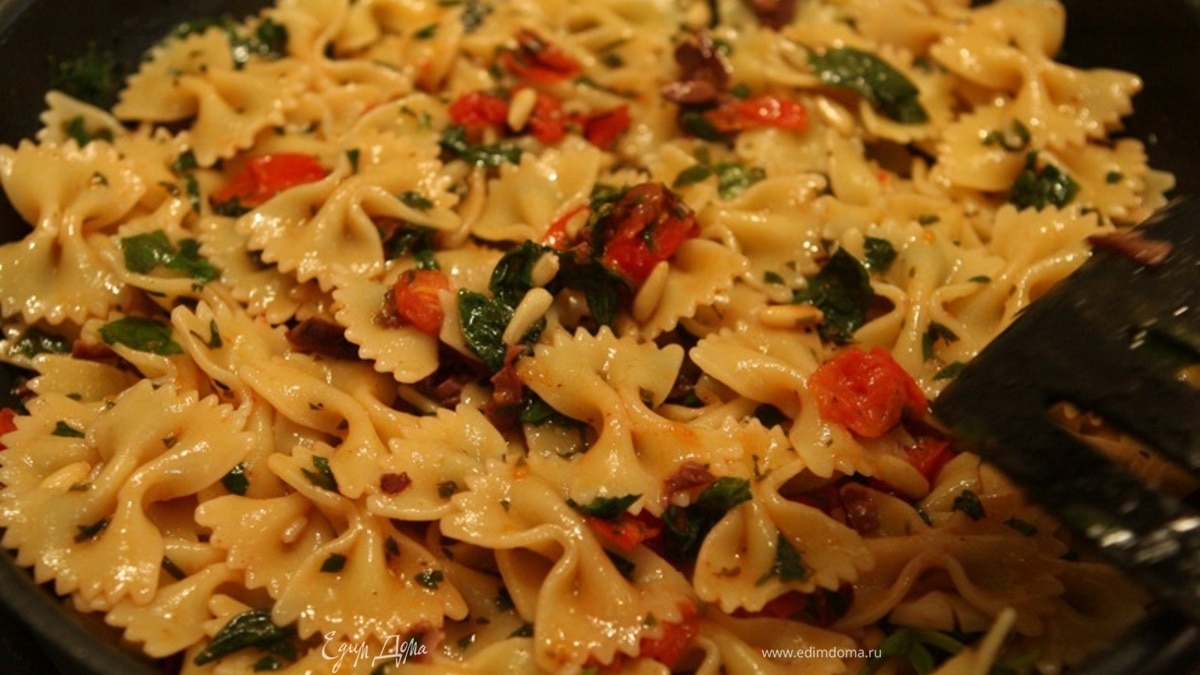 Макароны-бантики с помидорами, петрушкой и кедровыми орешками