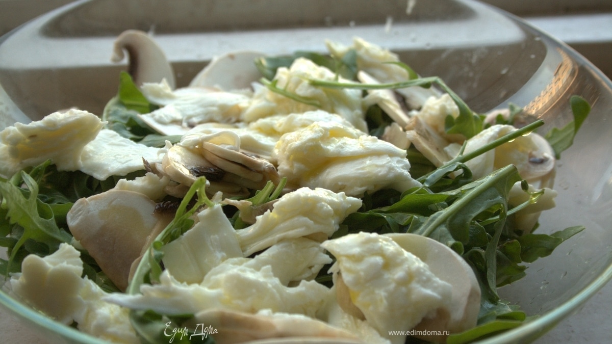 - Шаг 1Рукколу выложить в тарелку, сверху положить слой тонко нарезанных шампиньонов. Моцареллу порвать на полосочки и выложить поверх грибов. Все сбрызнуть оливковым маслом. Приятного аппетита!