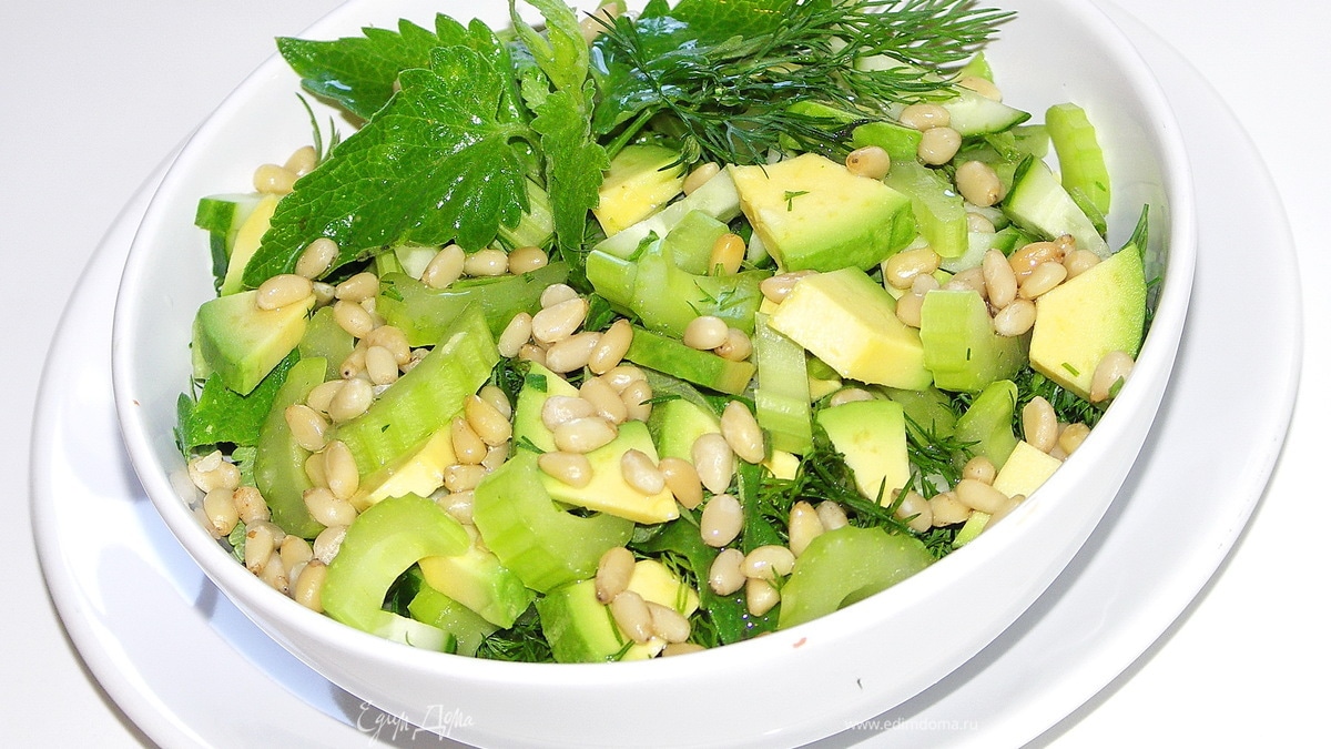 Порезать овощи и зелень.Посыпать орешками.Полить маслом.Посолить.Полить лимонным соком.Перемешать.Оставить на 5-7 мин и можно кушать.Приятного аппетита!:)
