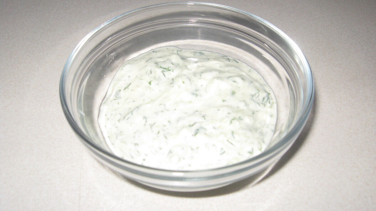 - Шаг 1Натереть на мелкой овощной терке огурец, мелко нарезать укроп. Смешать сметану, майонез, огурец, укроп. Добавить соль и перец.