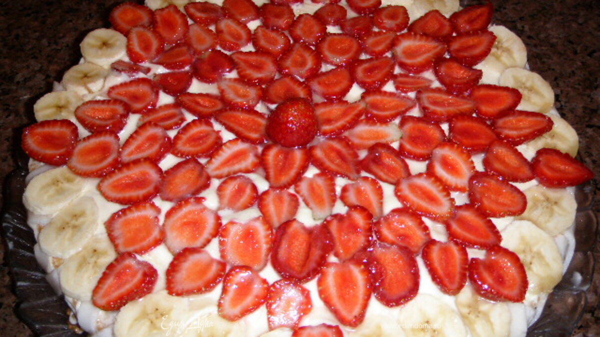 - Шаг 44)Намазать корж кремом, выложить на крем резаные бананы, клубнику, и посыпать орехами. Сверху начинки положить еще немного крема , чтоб верхний корж не отслаивался, когда будете нарезать торт.