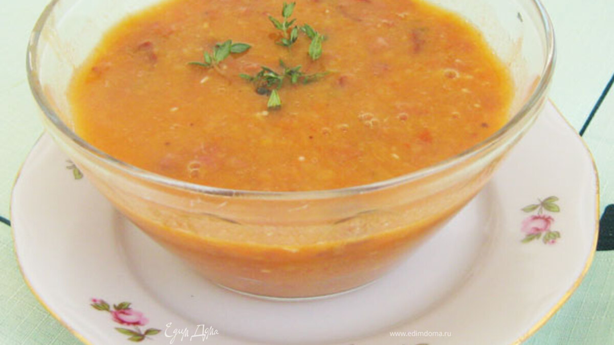 - Шаг 1У меня был колотый горох. Его я замочила перед уходом на работу, получилось на 9 часов (обязательно в холодной воде!). По возвращению вечером сменила воду (1 литр) и поставила варить. Как закипело, сняла пенку и добавила крупно нарезанную морковь. Через 30 минут с момента закипания, горох и морковь разварились. И я их протерла через дуршлаг (наверное можно взбить и блендером). Пюре снова поставила на огонь, добавила нарезанную грудинку, ложку томатной пасты. Нарезанный лук обжарила в небольшом количестве масла, тоже добавила и посолила. Вот и все. Общее время приготовления 40 минут. Вкусно … очень. А, для гурманов можно подсушить гренок из белого хлеба и тоже добавить в суп.
