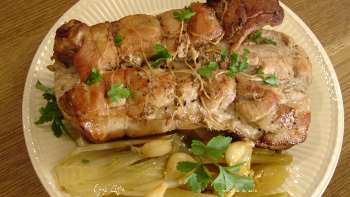 Готовой свинине дать постоять около 20 минут, затем нарезать и сразу подавать.
