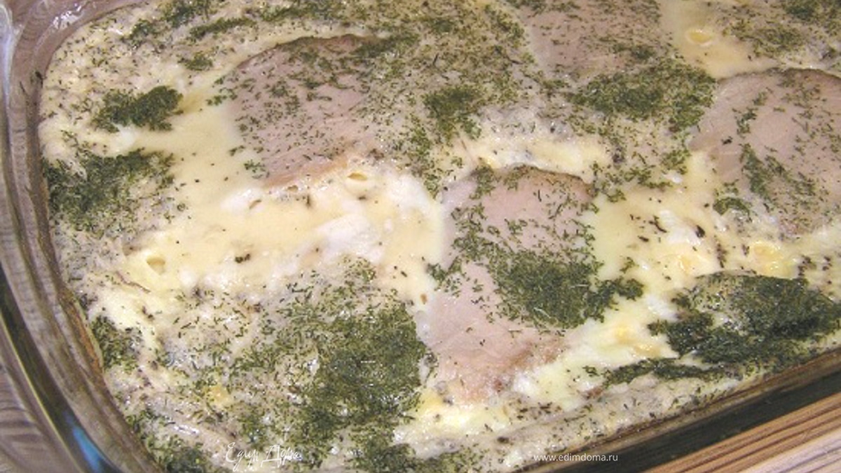 Сыр аккуратно залить яичной смесью, сверху разложить ломтики свинины, посыпать укропом. Выпекать при 190*С 15-20 минут.