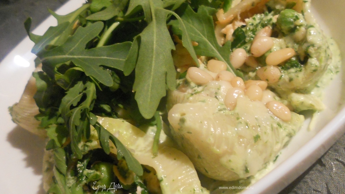Паста "ракушки" с семгой, зеленым горошком и пряным соусом из руколы