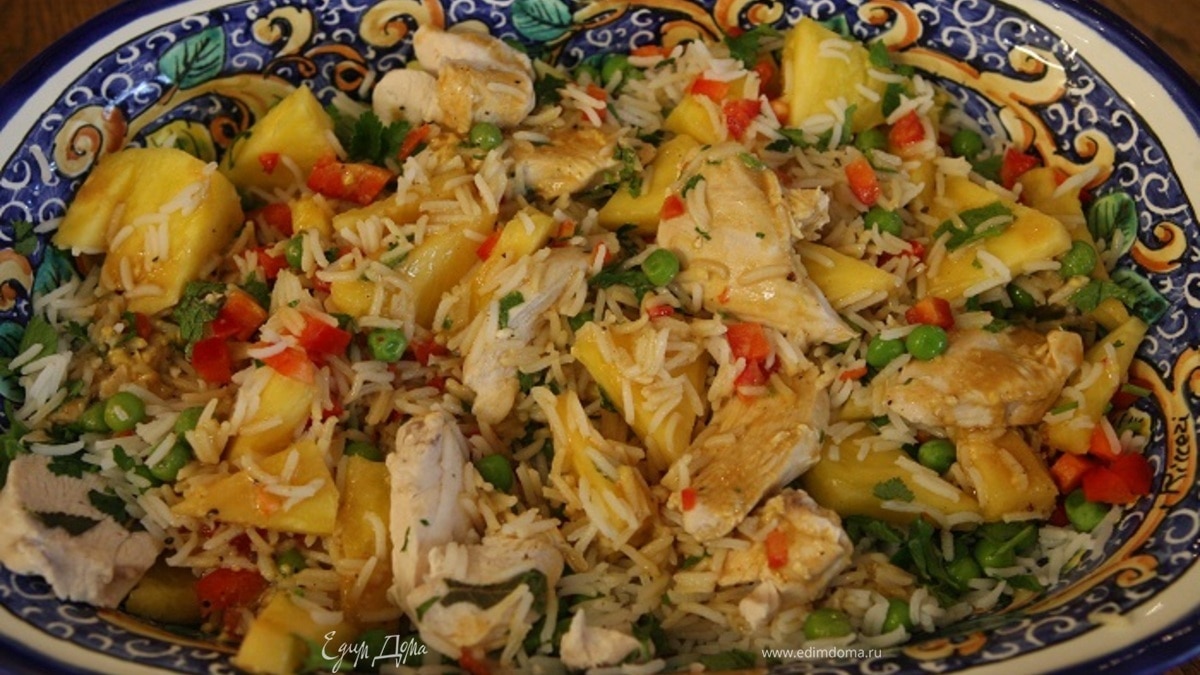 Рисовый салат с курицей, ананасом и зеленым горошком