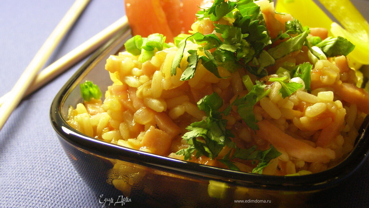 Добавить к рису томат, ветчину и лук. Перемешать. Накрыть крышкой и дать настояться минут 5. - Шаг 8