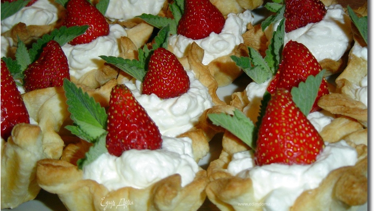 Раскатайте слоеное тесто до толщины 3 -4 мм, разрежьте на квадраты. Уложите в небольшие формы, оттягивая уголки. Проколите тесто. Выпекайте при температуре 250 гр. , до золотистого цвета. Охладите.Взбейте сливки до устойчивой пены. Перемешайте их с сахарной пудрой.Разложите взбитые сливки в выпеченные корзиночки. Сверху уложите клубнику и мяту. Получается вкуснота и красота! Приятного аппетита!!!!! - Шаг 2