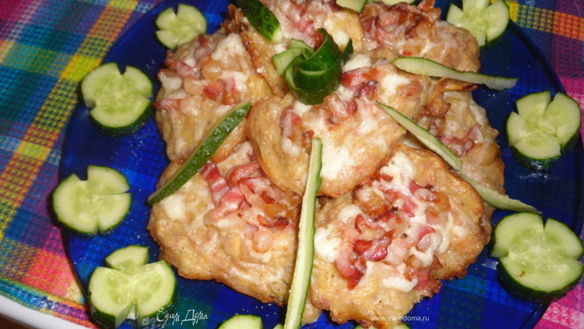 картофель потереть на средней терке. Добавить фарш,яйцо, сметану, муку,соль(если нужно), специи. Все хорошенько перемешать.Противень смазать раст. маслом и выложить небольшие лепешки.Сверху выложить порезанную соломкой грудинку.Запекать практически до готовности.Минут за 7-10 полить майонезом или сметаной. - Шаг 2