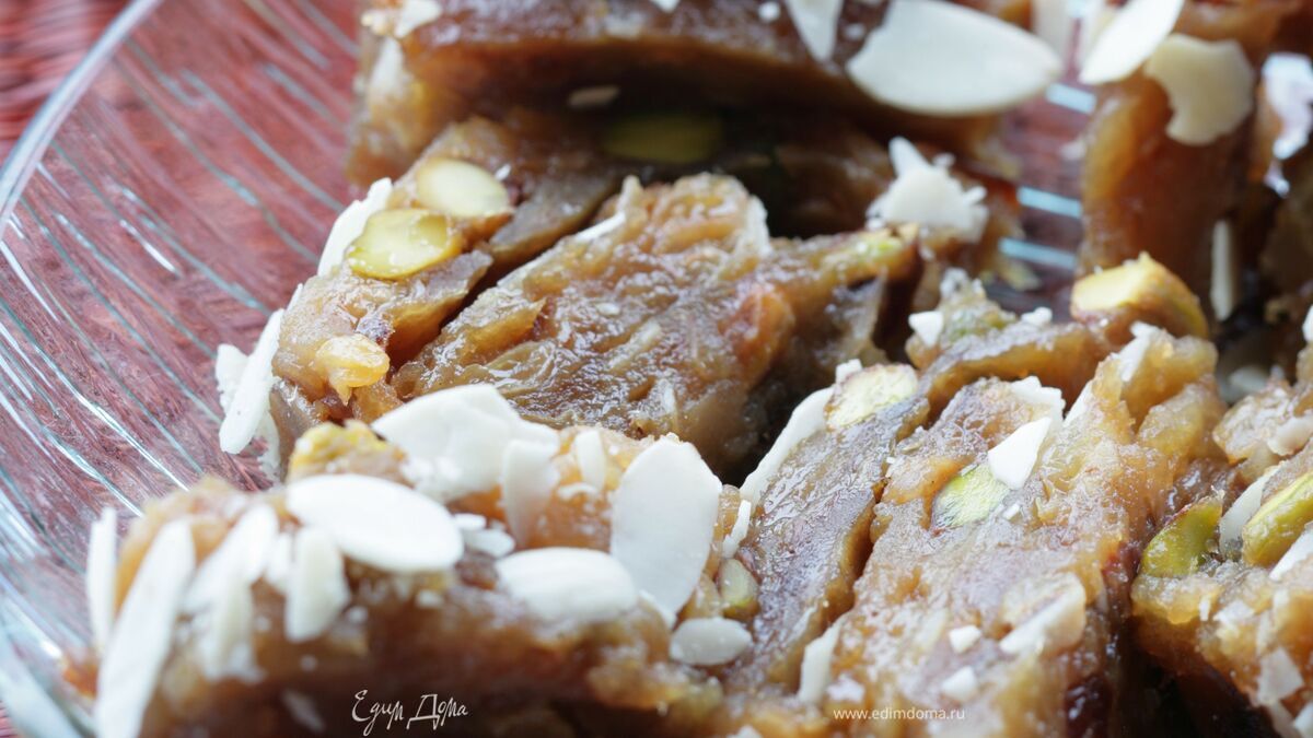 1. В кастрюле обжарить на сливочном масле нарезанные мелко яблоки, пока они не размякнут и не станут слегка коричневатыми. 2. Влить воду и варить на медленном огне, постоянно помешивая, пока яблоки не загустеют (около 15 минут). 3. Добавить сахар и вымешивать, пока смесь не начет отставать от дна, затем прибавить огонь и варить, не переставая помешивать, пока жидкость окончательно не испарится. 4. Когда смесь станет прозрачной по краям, а мешать ее станет совсем трудно, добавить в нее изюм и орехи и варить еще 2 минуты, затем снять с огня. 5. Выложить смесь на противень и сделать пласт толщиной в палец. Когда он окончательно застынет, нарезать кусочки любой формы.