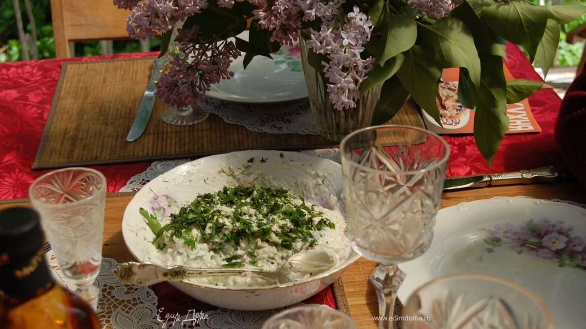 мой свёкр почему-то уверен, что огурец надо во что бы то ни стало очистить от кожуры. Далее его необходимо нашинковать мелкой-мелкой соломкой,а еще лучше восполтзоваться тёркой, аналогично поступить с редиской и болгарским перцем. Заправляем смесью кефира со сметаной, если огурцы водянистые - кладем больше сметыны. Заправив перчим, солим, посыпаем мелко нарубленной зеленью и чесноком! Отличный салат в такую жаркую погоду! Всем приятного аппетита!