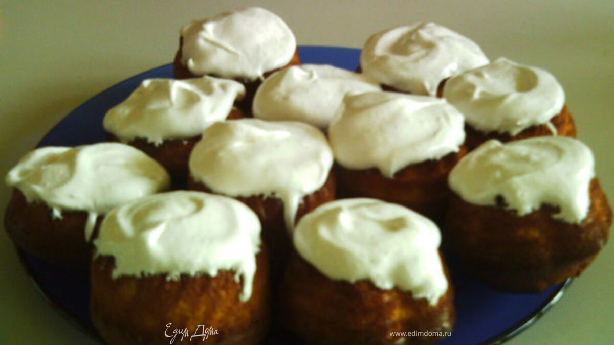 - Шаг 3Приготовить глазурь. Белки взбить с сахаром в густую, плотную пену. На охлажденные кексы нанести глазурь. Хотя можно и без нее)