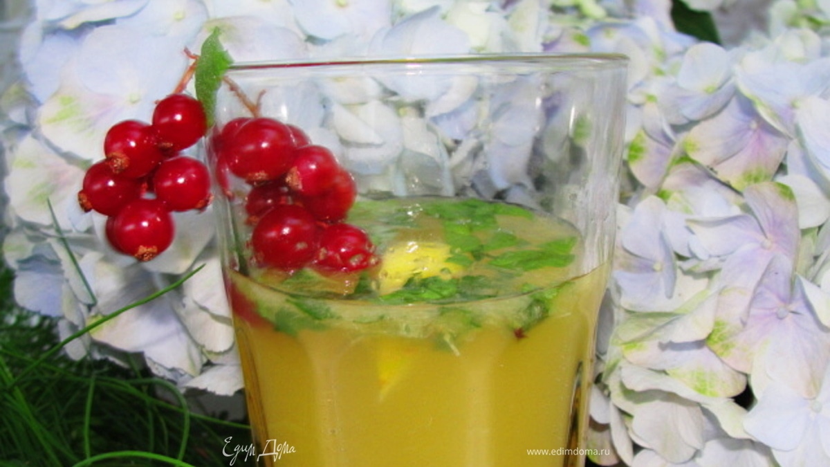 Мелко рубим мяту и засыпаем сахаром. Смешиваем в стакане соки, вливаем в стакан с мятой в сахаре и заливаем минеральной водой, добавляем лед и украшаем смородиной.