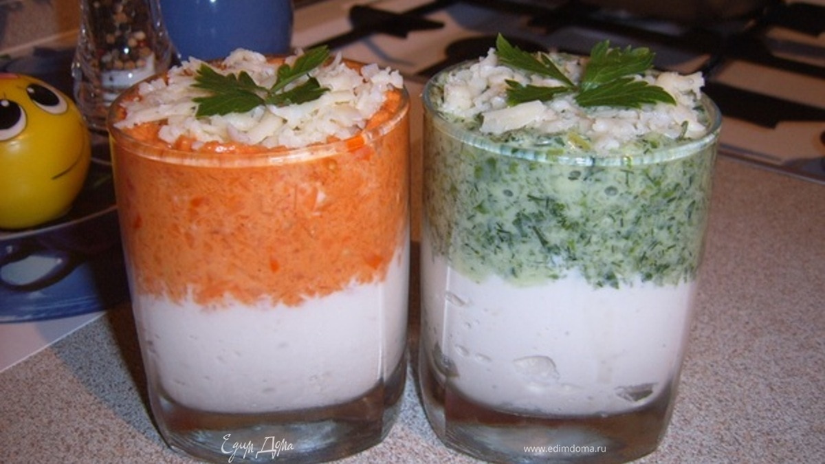 - Шаг 1Нижний слой – измельчить в блендере курицу+чеснок+йогурт+соль(+немного винного уксуса с ароматом грецкого ореха я капнула). Верхний слой №1 – измельчить в блендере корейскую морковь+1/2 помидора+плавленый сырок Верхний слой №2 – измельчить в блендере огурец+перцы пепперони+зелень +плавленый сырок. Сверху слегка присыпала твердым терттым сыром и украсила петрушкой.