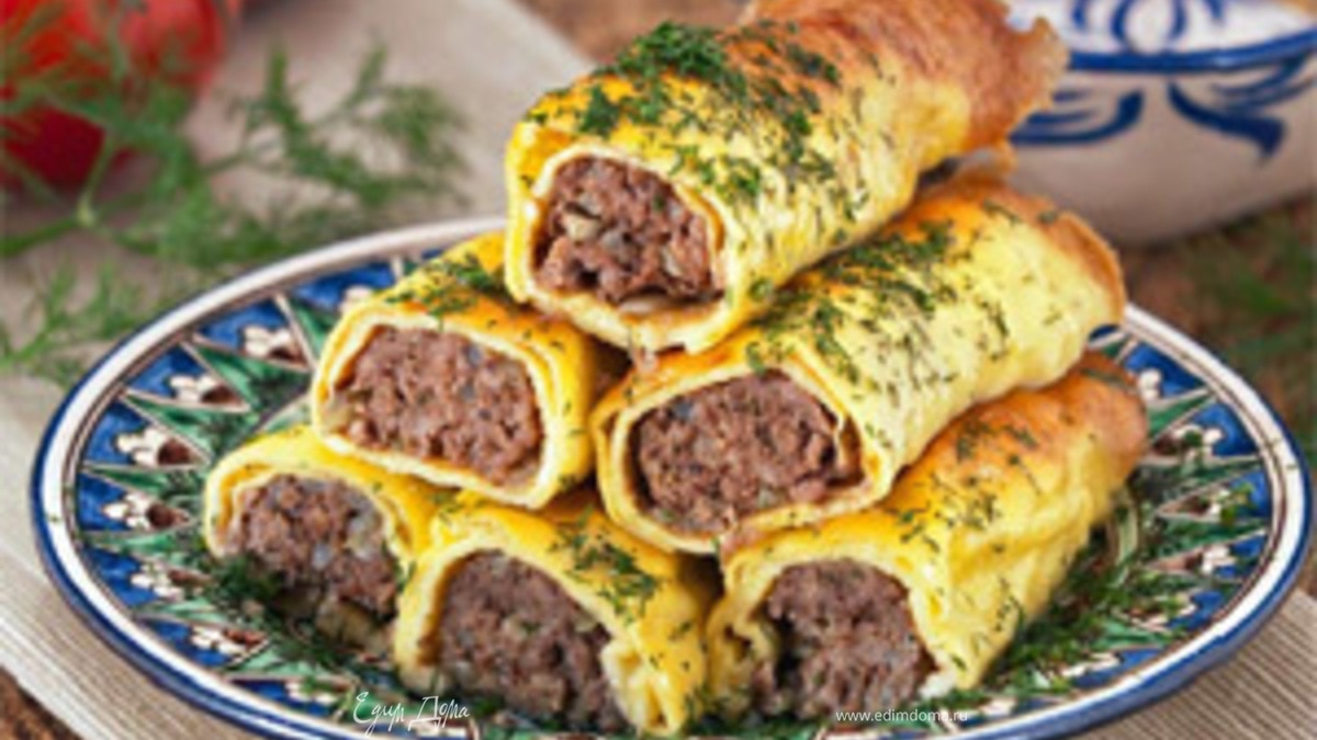 - Шаг 3На каждый блинчик выложить фарш, свернуть рулетиком. Духовку разогреть до 180°С, противень смазать оставшимся маслом, выложить на него рулетики, запекать в духовке в течение 35–40 минут. Укроп вымыть, мелко нарезать. При подаче рулетики полить сливочным маслом и посыпать рубленым укропом.