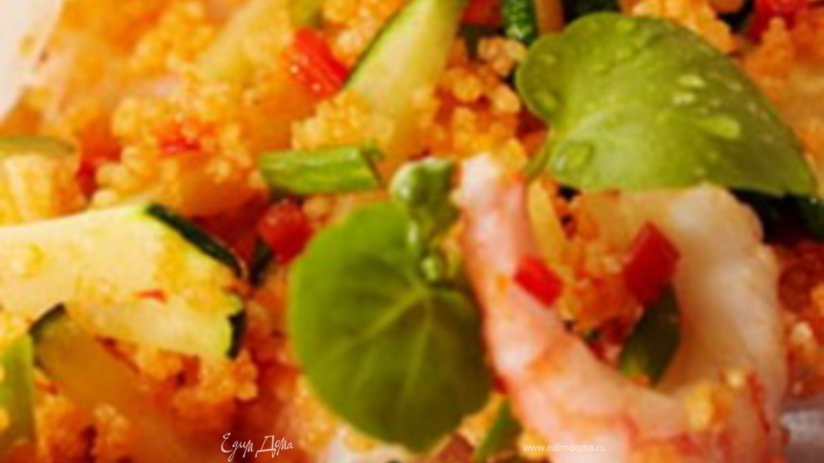 Мелко порубить перец чили и чеснок, кабачок нарезать полосками. Нагреть оливковое масло в сковородке и добавить чеснок и перец чили. Перемешать креветки, полоски кабачка и томатный сок. Посолить.
