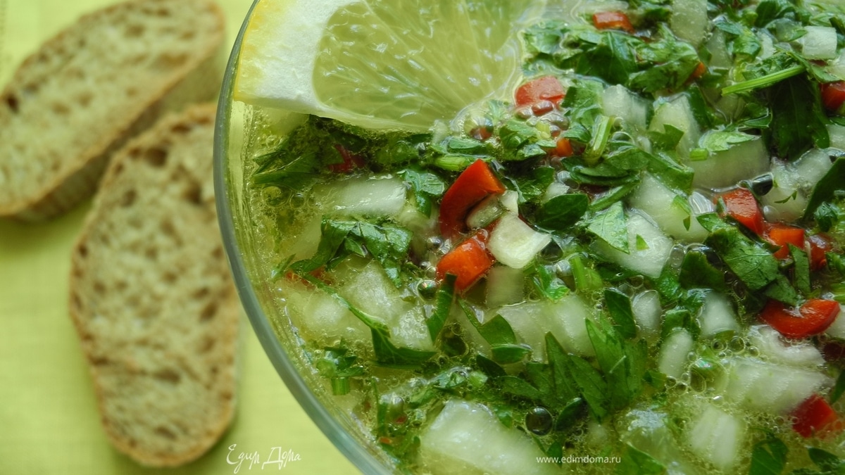 Нашинковала петрушку и лук. Нарезала мелко перец чили (освободив от семян). Смешала лимон, петрушку, лук,чили, соль, оливковое масло. Оставила на час. Затем залила минеральной водой. По рецепту еще добавляется лед. Очень вкусно есть этот суп с чиабаттой, слегка подсушенной или обжаренной!