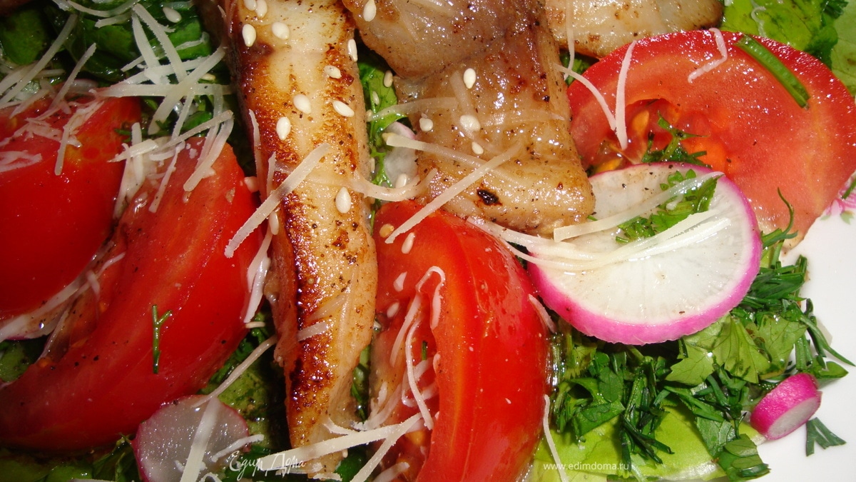 Режем крупными полосками филе рыбы, солим, перчим, обжариваем на раскаленной сковороде с оливковым маслом мин 2, добавляем 1 ст л соевого соуса и еще мин 3, для рыбы достаточно. Оливковое масло смешиваем с соком лимона, добавляем 1 ч л бальзамического уксуса, солим, перчим, взбалтываем.Овощи нарезаем произвольно, салат рвем руками, выкладываем на тарелку,режем кинзу и укроп,перемешиваем с листьями, поливаем частью заправки, далее кладем овощи по кругу, поливаем их оставшейся заправкой, а в середину выкладываем полосочки рыбки, посыпаем только её кунжутом, и все прамезаном. Приятного аппетита!!!